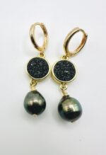 Stunning Tahitian or Freshwater Pearls Earrings with a Druzy Agate Crystal or Abalone and 14k Gold Details. Choose your color.